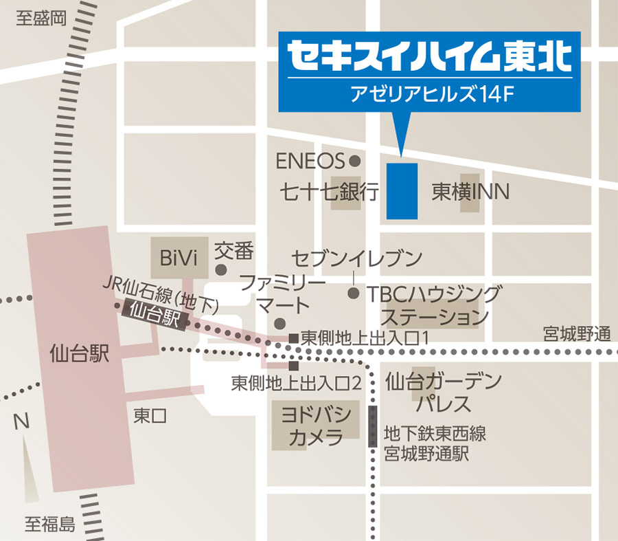 | 所在地 | 〒983-0852 仙台市宮城野区榴岡3-4-1アゼリアヒルズ14階 TEL:022-369-3816 FAX:022-369-3817 Mail:info-heim-tohoku@sekisui.com ▽アクセスマップ [Google Mapsで見る] ![]() |